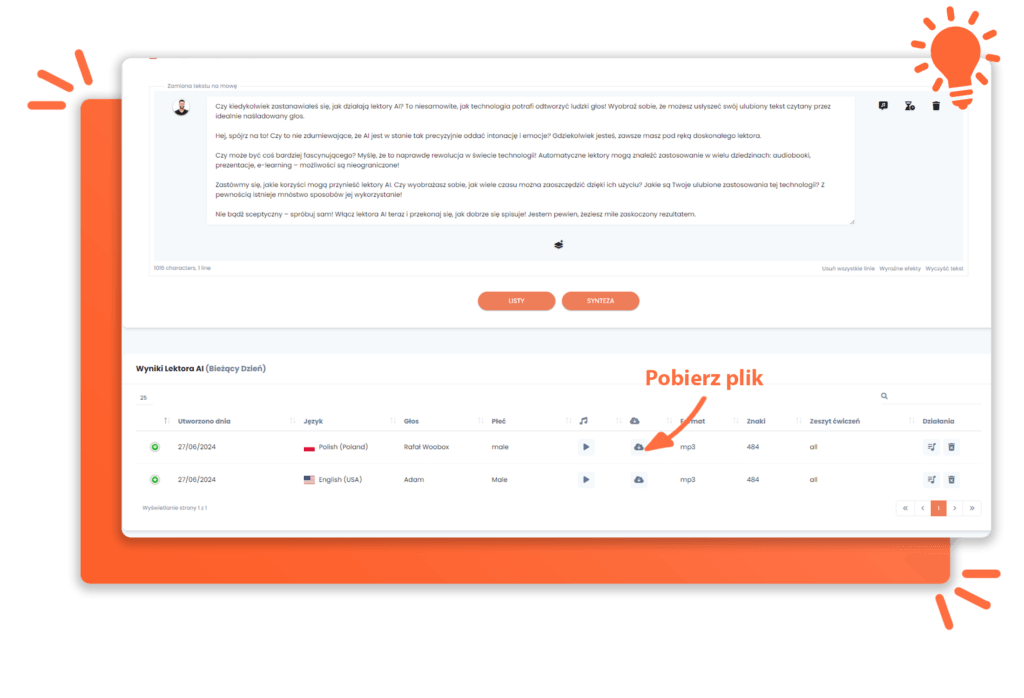 - Kliknij „Synteza”: Po dokonaniu wszystkich ustawień, kliknij przycisk synteza. System szybko przetworzy Twój tekst i wygeneruje gotowe nagranie głosowe.
